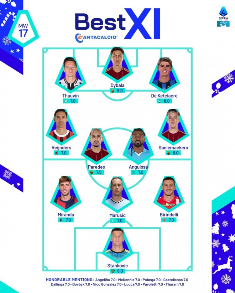 12月24日訊 意甲官方評選了第17輪最佳陣容,具體如下: