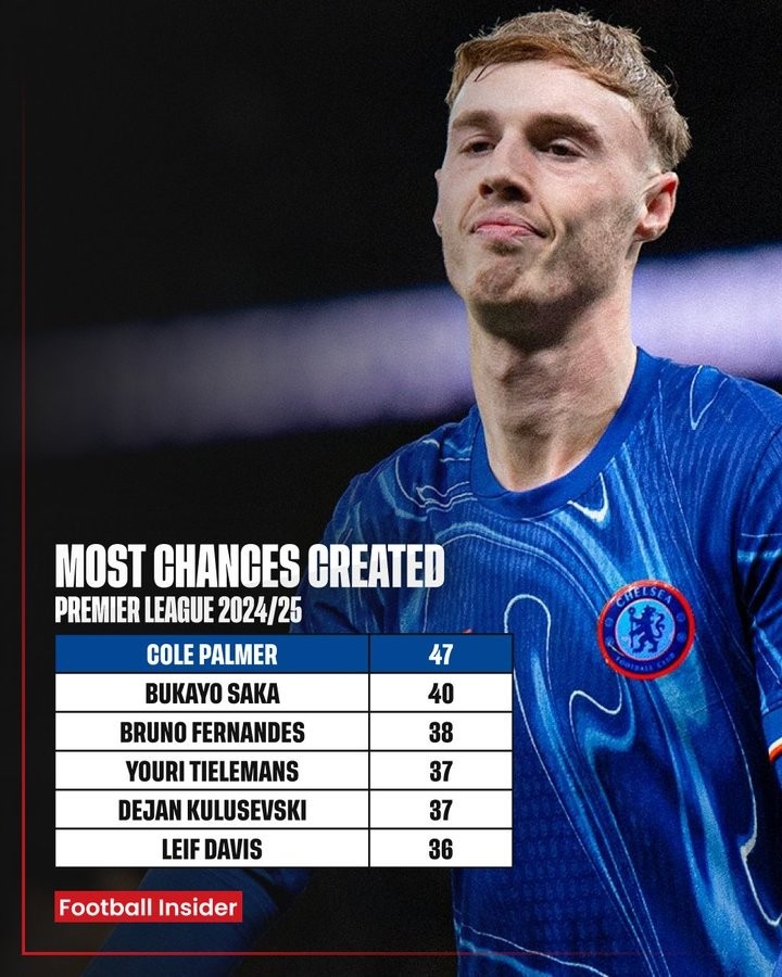 12月25日訊 Football Insider統(tǒng)計,帕爾默是本賽季至今英超創(chuàng)造機會次數(shù)最多的球員。