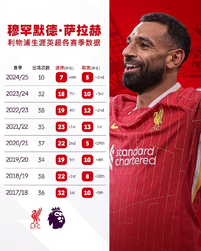 11月6日訊 英超官方微博列出薩拉赫在利物浦的英超賽季數(shù)據(jù)統(tǒng)計,包括出場數(shù)、進球數(shù)和助攻數(shù)。