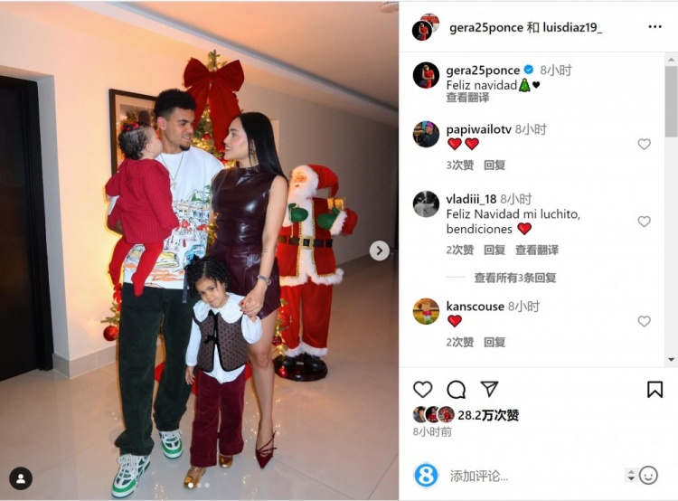 12月25日訊 利物浦前鋒路易斯-迪亞斯與伴侶格拉更新社媒動(dòng)態(tài),慶祝圣誕節(jié)的到來。