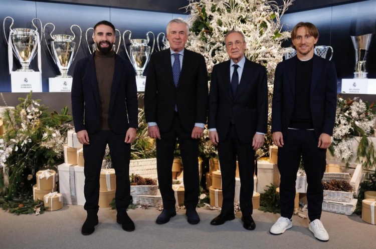 皇馬官方社媒曬出俱樂部主席弗洛倫蒂諾、主帥安切洛蒂、球員代表卡瓦哈爾、莫德里奇的合照,他們身后則是圣誕樹和獎杯。