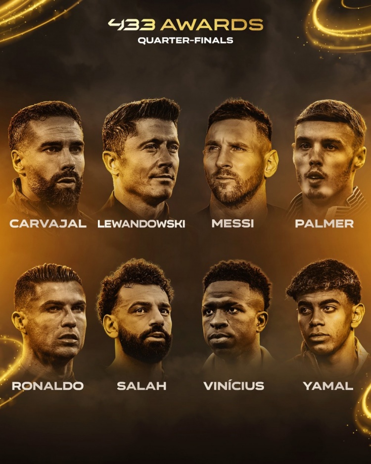 12月25日訊 媒體433列出了2024年度最佳球員評選8強,梅西、C羅、萊萬、維尼修斯、薩拉赫在列。