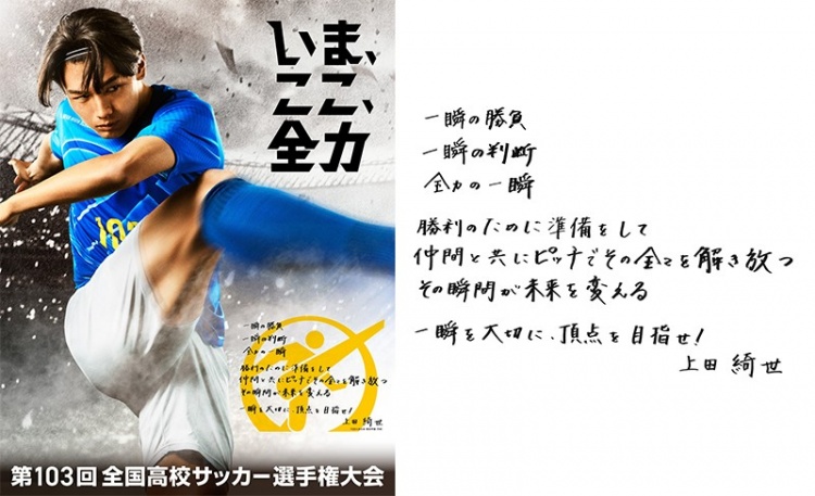 本屆高中足球錦標(biāo)賽的口號(hào)為:“就在此時(shí),就在此地,全力以赴”,應(yīng)援隊(duì)長(zhǎng)由日本國(guó)腳上田綺世擔(dān)任,他在第95屆高中足球錦標(biāo)賽上有著出色表現(xiàn),然后進(jìn)入到法政大學(xué)學(xué)習(xí),并憑借在鹿島鹿角的表現(xiàn)開(kāi)啟留洋生涯,目前他效力于荷甲強(qiáng)隊(duì)費(fèi)耶諾德。