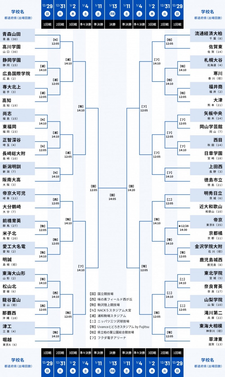 衛(wèi)冕冠軍青森山田首輪將對(duì)戰(zhàn)高川學(xué)園,另一支熱門球隊(duì)日章學(xué)園首輪將對(duì)戰(zhàn)西目高中。決賽將于明年1月13日進(jìn)行。