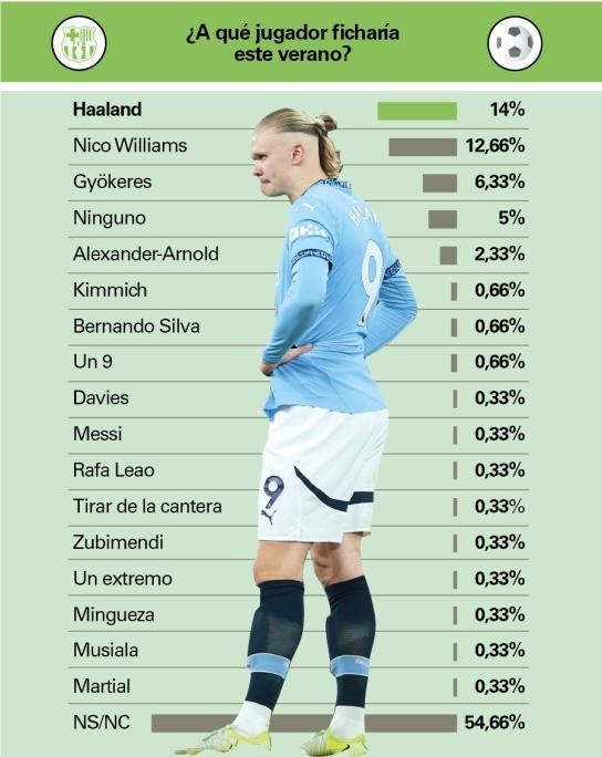 12月27日訊 西班牙《世界體育報》委托Estudi Press對巴薩球迷進(jìn)行了采訪和投票,向他們詢問了在冬窗想引進(jìn)的球員或補(bǔ)強(qiáng)的位置。哈蘭德和尼科-威廉姆斯成為最受巴薩球迷期待的引援,而左后衛(wèi)和中鋒則被認(rèn)為是最需要補(bǔ)強(qiáng)的位置。