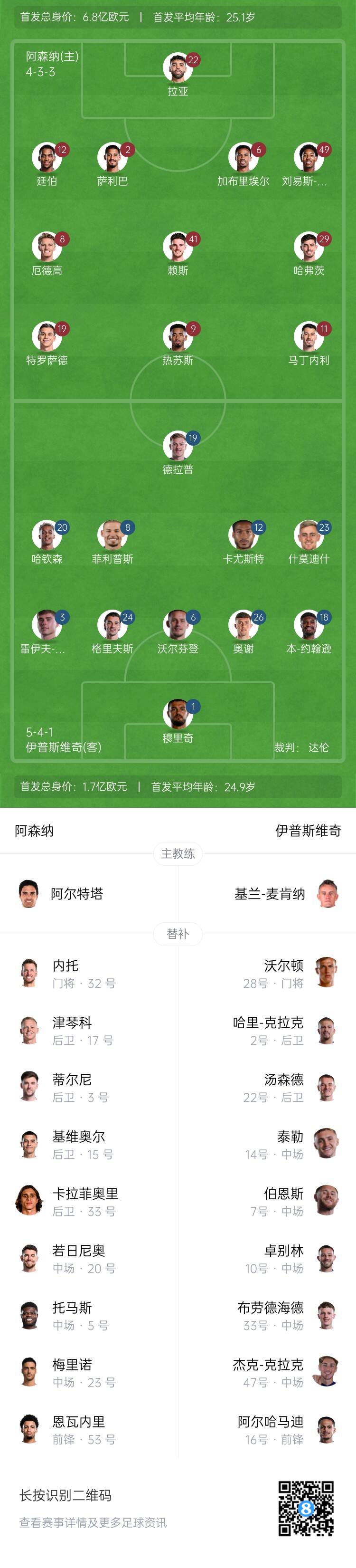 阿森納首發(fā):22-拉亞、2-薩利巴、6-加布里埃爾、12-廷伯、49-斯凱利、41-賴斯、8-厄德高、29-哈弗茨、11-馬丁內(nèi)利、19-特羅薩德、9-熱蘇斯