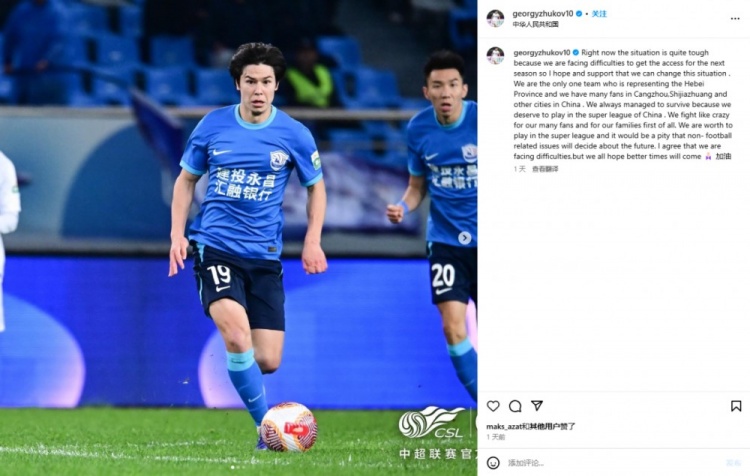 12月29日訊 關(guān)于滄州雄獅俱樂(lè)部的現(xiàn)狀,球隊(duì)外援朱可夫也在社媒發(fā)文進(jìn)行了介紹,他希望球隊(duì)能夠挺過(guò)難關(guān),繼續(xù)出現(xiàn)在中超舞臺(tái)。