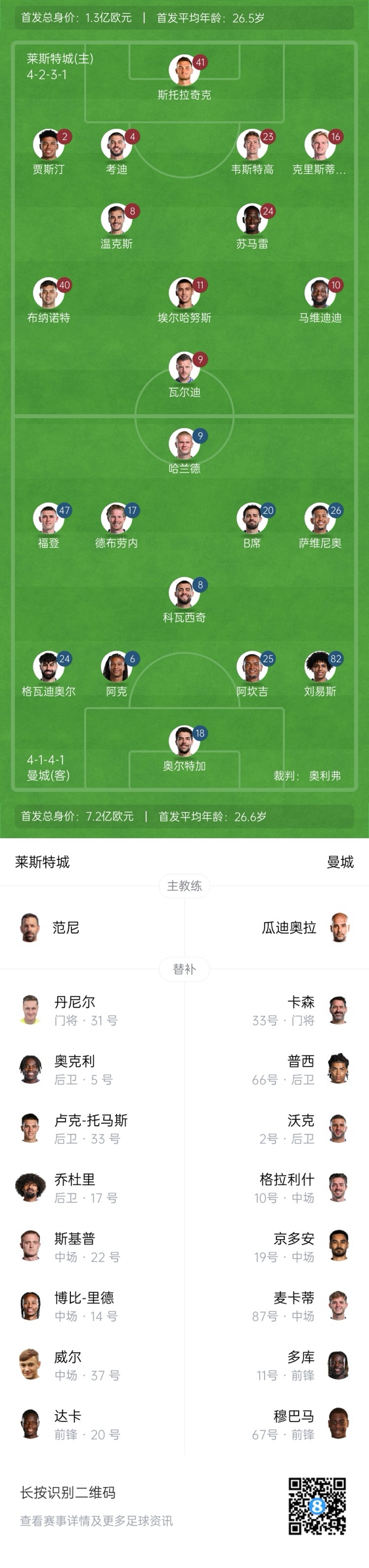 萊斯特城首發(fā):41-斯托拉奇克、2-賈斯汀、4-考迪、23-韋斯特高、16-克里斯蒂安森、8-溫克斯、24-蘇馬雷、10-馬維迪迪、11-埃爾哈努斯、40-布納諾特、9-瓦爾迪