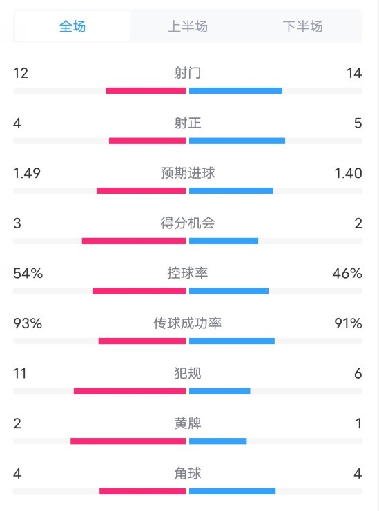 全場(chǎng)比賽數(shù)據(jù)如下(曼城在后):