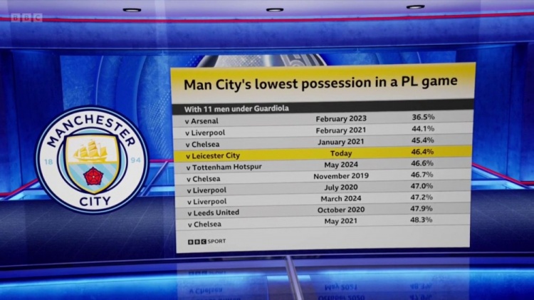 12月30日訊 英超第19輪比賽,曼城客場(chǎng)2-0擊敗萊斯特城。據(jù)BBC統(tǒng)計(jì),此役曼城控球率46.4%,這是瓜帥上任以來曼城在11人情況下控球率第4低的英超比賽。