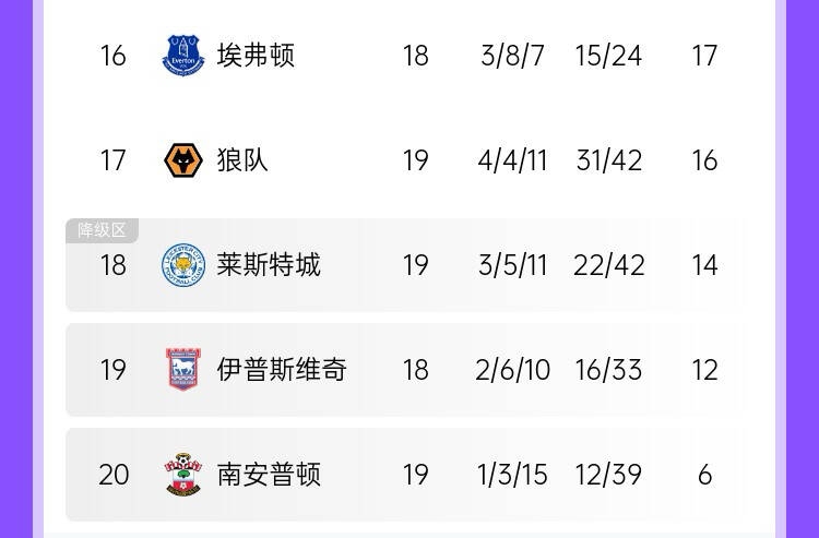 目前,降級區(qū)的三支隊伍均是本賽季的升班馬球隊:萊斯特城、伊普斯維奇、南安普頓。值得一提的是,去年升級的三兄弟伯恩利、謝菲聯(lián)和盧頓賽季結束時全部打道回府,掉回英冠。