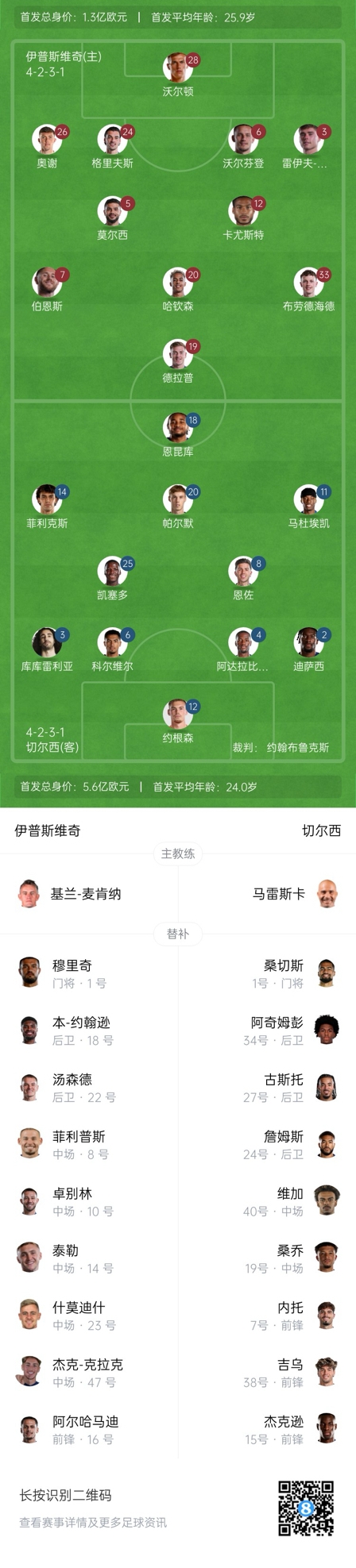 12月31日訊 英超第19輪,伊普斯維奇主場迎戰(zhàn)切爾西,賽前首發(fā)名單公布。