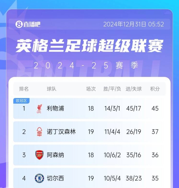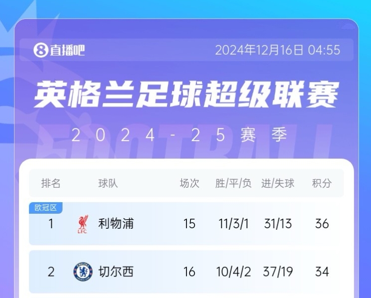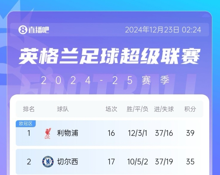 12月30日,利物浦5-0大勝西漢姆;12月31日,切爾西0-2伊普斯維奇,兩連敗后掉到第四,與榜首的差距拉到10分。