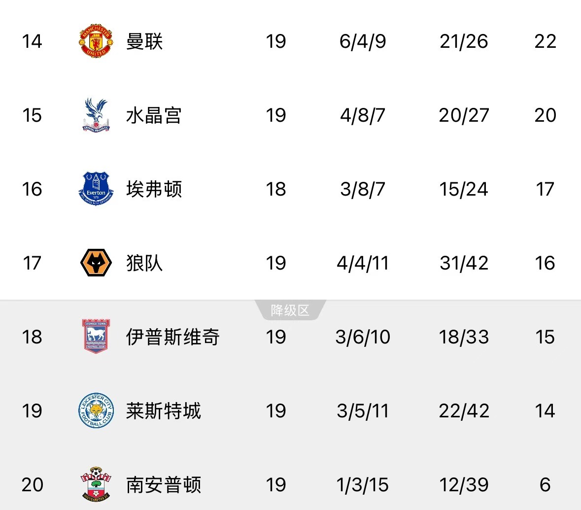值得一提的是,曼聯(lián)目前凈勝球仍為負(fù)數(shù),目前僅打進(jìn)21球,在進(jìn)球數(shù)上低于降級(jí)區(qū)的萊斯特城,藍(lán)狐目前19場(chǎng)打進(jìn)了22球,但總計(jì)丟了42球,比曼聯(lián)多丟了16球。目前曼聯(lián)高降級(jí)區(qū)7分。