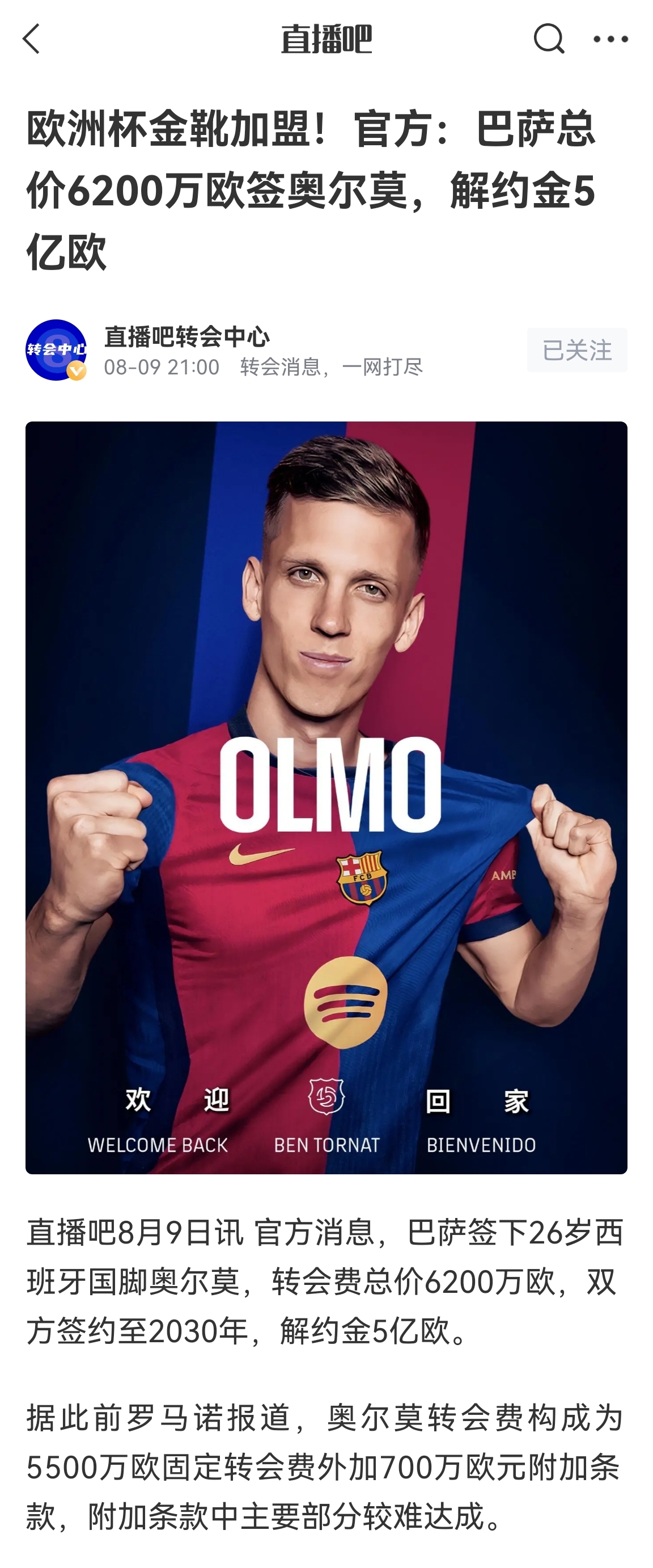12月31日訊 當?shù)貢r間12月31日23點59分,即北京時間1月1日6點59分之前,如果巴薩仍然沒有在西甲官網(wǎng)對奧爾莫進行注冊,那么按照合同約定,今夏5500萬歐元加盟巴薩的奧爾莫可以解除與巴薩的合同,在2025年冬窗自由身加盟任何球隊。