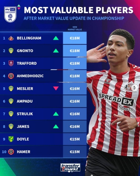 12月31日訊 德轉(zhuǎn)列出了英冠球員身價(jià)榜前10,桑德蘭19歲中場喬貝-貝林厄姆1800萬歐并列第一。