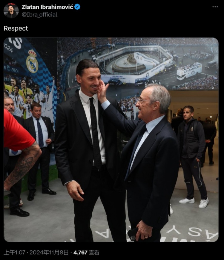 在個人社媒,伊布曬出皇馬主席弗洛倫蒂諾輕撫他臉頰的照片,同時配文:尊重。
