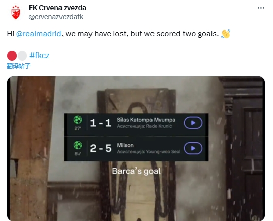 11月8日訊 貝爾格萊德紅星歐冠中主場2-5不敵巴薩,他們官推發(fā)文調(diào)侃皇馬。