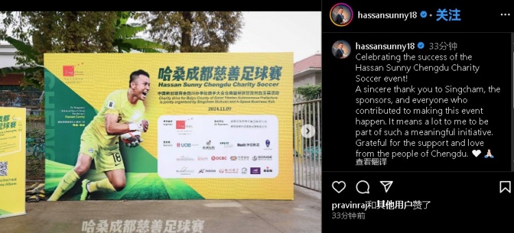 11月9日訊 前新加坡國門哈桑更新社媒,曬出自己在成都參加慈善足球賽的圖片。