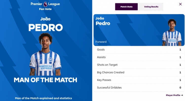 11月10日訊 英超第11輪,布萊頓2-1逆轉(zhuǎn)擊敗曼城。賽后,傳射建功若昂-佩德羅當(dāng)選全場最佳球員。