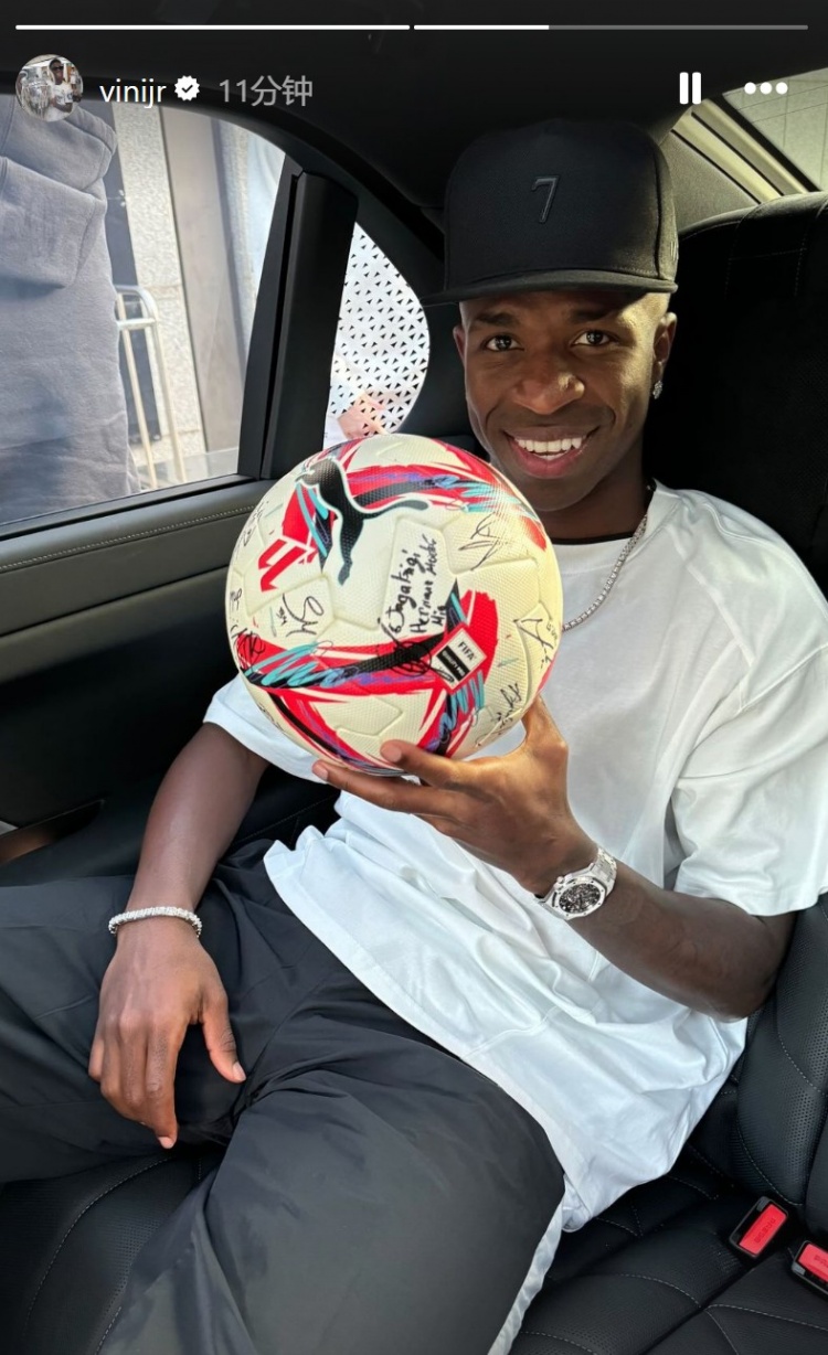維尼修斯也更新了社媒,曬出自己手捧比賽用球的照片,笑得十分開心??梢钥吹?,皇馬隊友已經(jīng)為維尼修斯在比賽用球上簽了名。