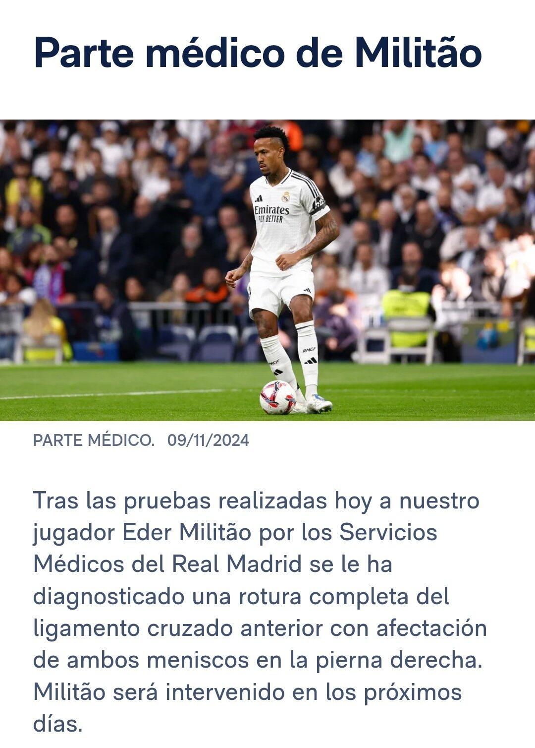 皇馬官方消息,米利唐右腿十字韌帶完全撕裂,伴有半月板受傷,未來(lái)幾天將接受手術(shù)。