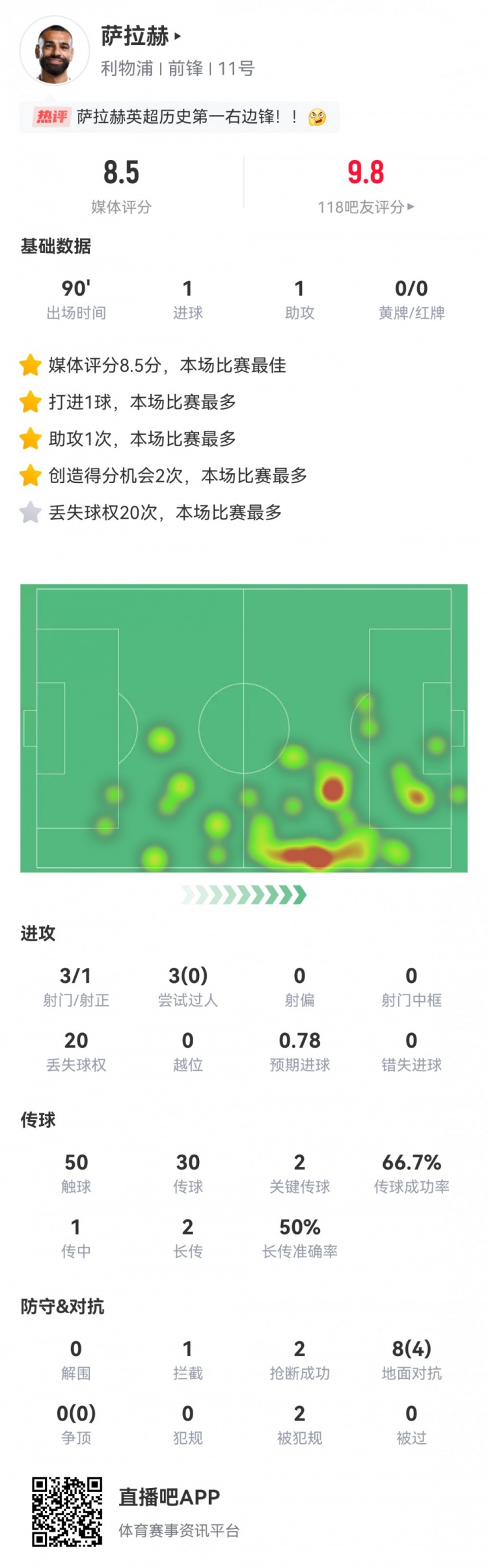 11月10日訊 本輪英超,利物浦2-0維拉各賽事四連勝,聯(lián)賽5分領(lǐng)跑。此役薩拉赫打滿全場(chǎng),球員全場(chǎng)重點(diǎn)數(shù)據(jù)如下↓