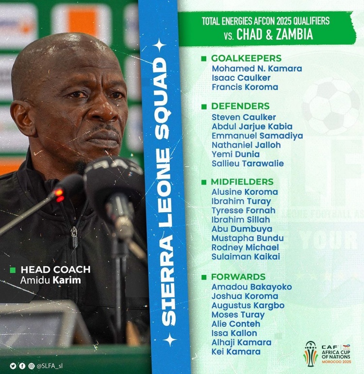 塞拉利昂國家隊(duì)公布25人大名單,伊薩-卡隆繼續(xù)隨隊(duì)征戰(zhàn)非洲杯預(yù)選賽,接下來的對(duì)手先后是??乍得和贊比亞。