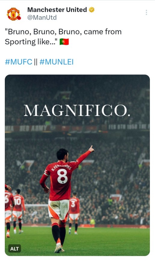 曼聯(lián)也在官推上po出了球迷為B費(fèi)寫的助威之歌:“布魯諾布魯諾,他來自葡體就像……”