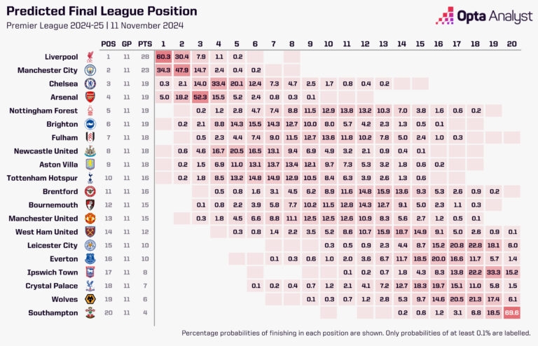 Opta計(jì)算本賽季英超奪冠概率: