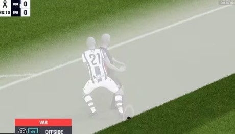 爭(zhēng)議畫(huà)面。電視轉(zhuǎn)播畫(huà)面讓人誤以為是阿格德位置更靠前,暗示這并非越位。這是一種視覺(jué)錯(cuò)覺(jué)。賽后,馬克-卡薩多呼吁重新審視這個(gè)判罰:"西甲應(yīng)該檢查一下是否是羅伯特的腳。"