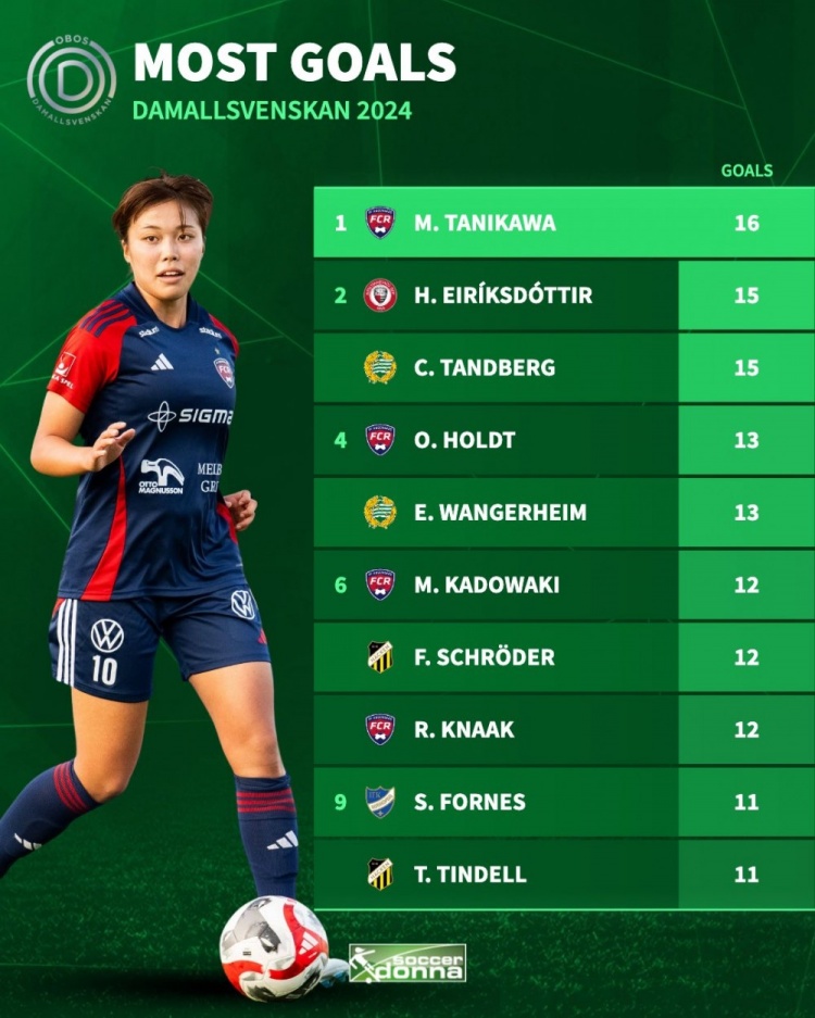 不僅如此,作為中場球員的古川萌萌子,還以16個進球成為了本賽季瑞典女足甲級聯(lián)賽的最佳射手。在9日的賽季末輪比賽,她攻入了一記非常漂亮的任意球破門。