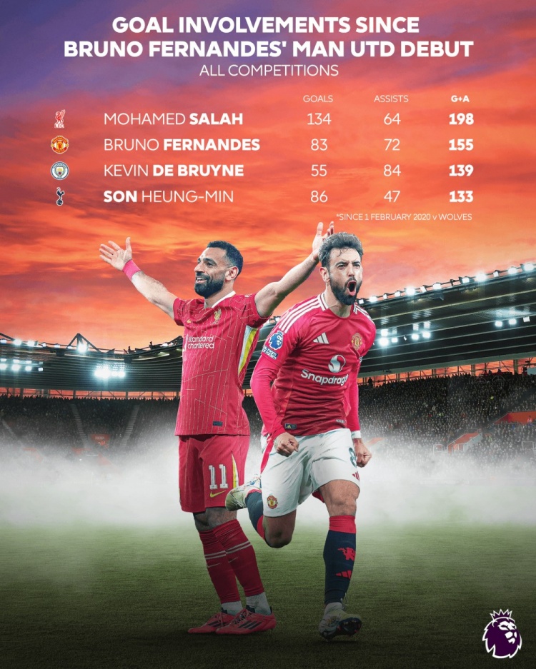 11月12日訊 據(jù)英超官方統(tǒng)計(jì),2020年2月上演曼聯(lián)首秀以來,B費(fèi)各項(xiàng)賽事參與155粒進(jìn)球,英超球員中同期僅少于薩拉赫。