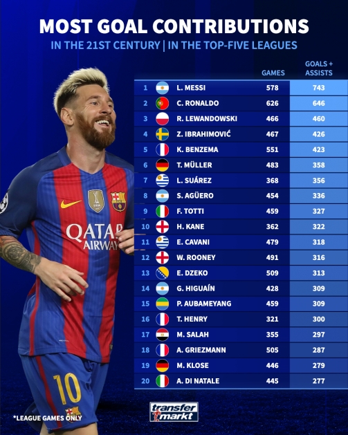 11月12日訊 德轉(zhuǎn)對(duì)21世紀(jì)球員在五大聯(lián)賽參與進(jìn)球(進(jìn)球+助攻)的數(shù)據(jù)進(jìn)行了統(tǒng)計(jì),梅西以578場(chǎng)743球的成績(jī)排名第1,C羅萊萬(wàn)分列2、3。