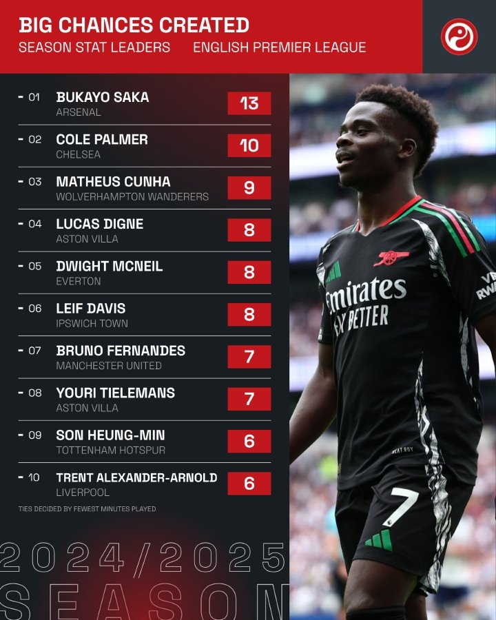 11月13日訊 Squawka統(tǒng)計(jì)表明,薩卡是本賽季英超球員里創(chuàng)造重要機(jī)會(huì)次數(shù)最多的球員。